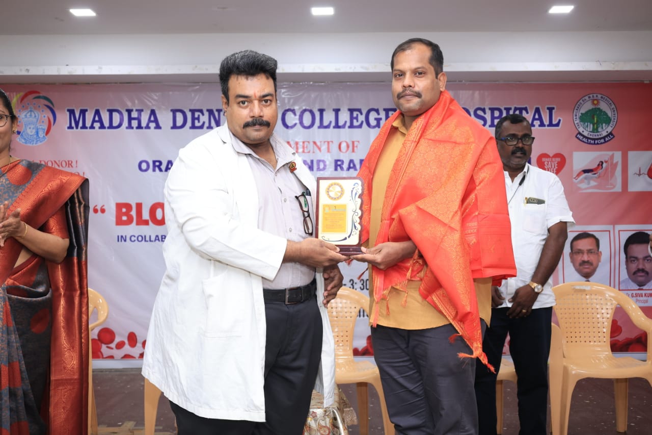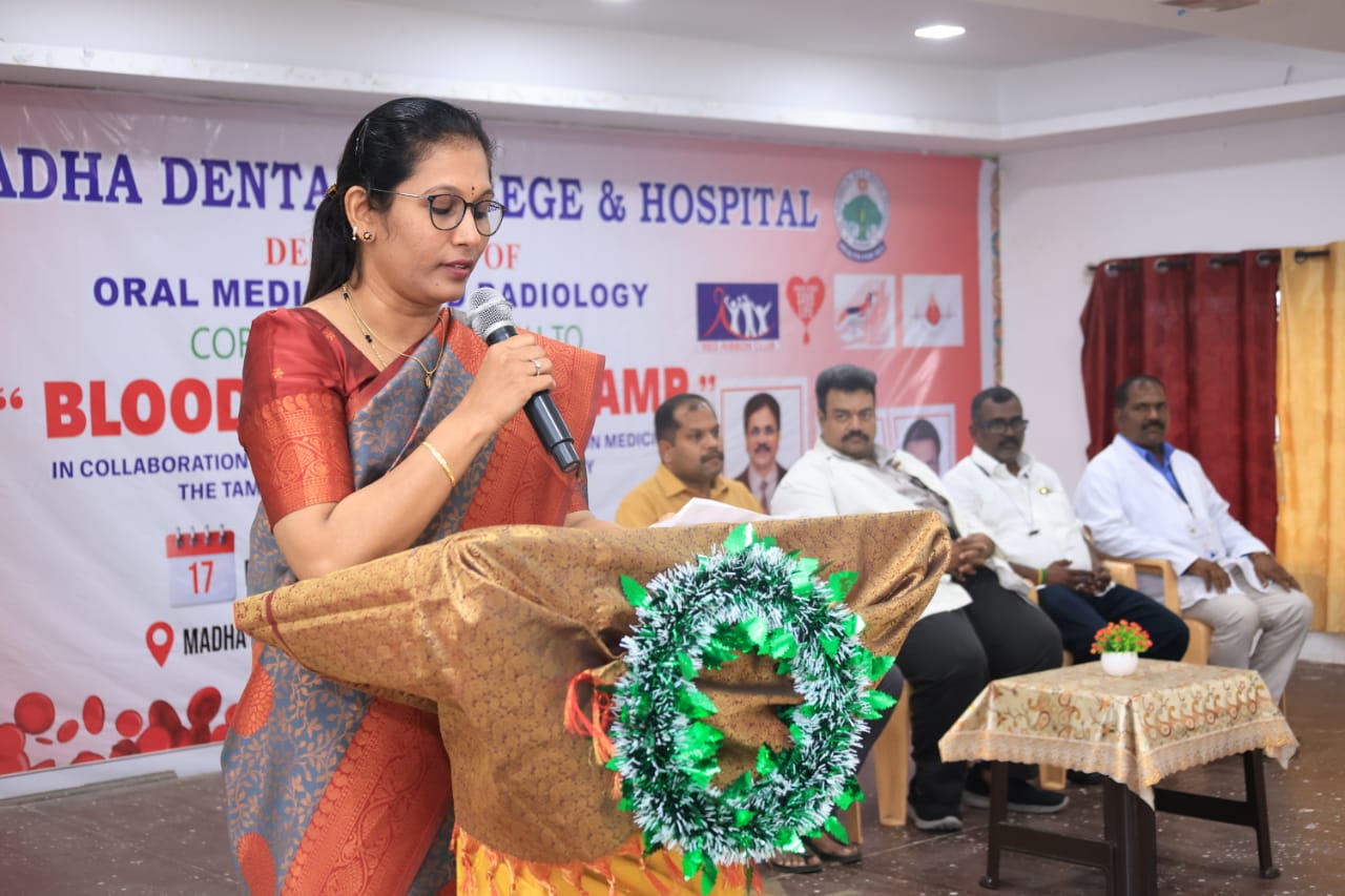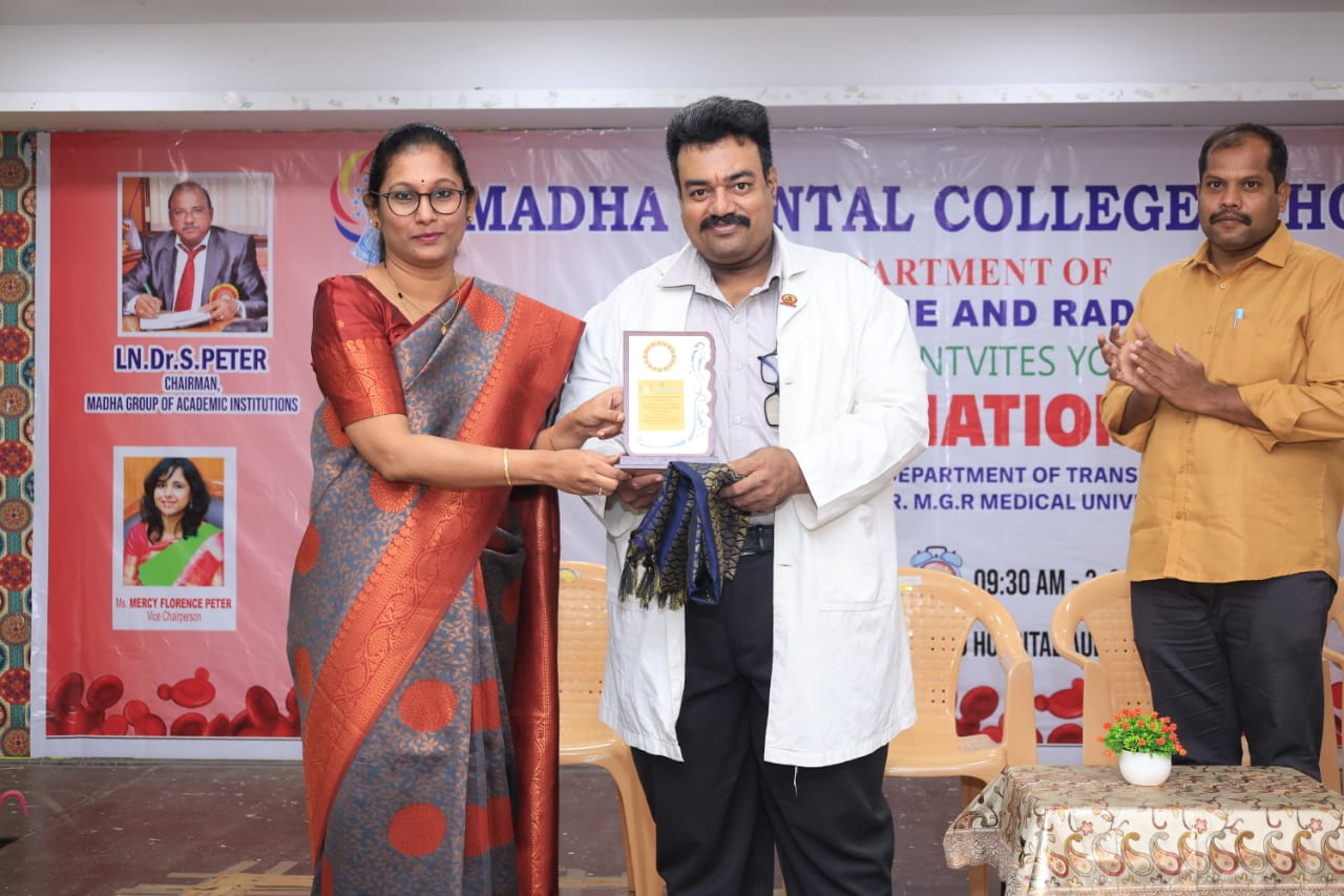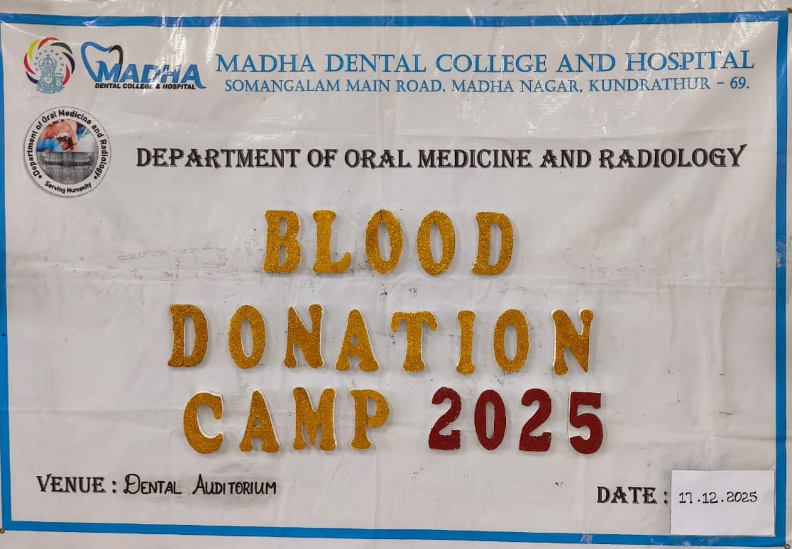 Voluntary blood donation camp was conducted at Madha Dental College and Hospital, Kundrathur on 17.12.2025 by the Department of Oral Medicine and Radiology in co-ordination with the Department of Transfusion Medicine, “The Tamil Nadu Dr. M.G.R Medical University” Chennai.